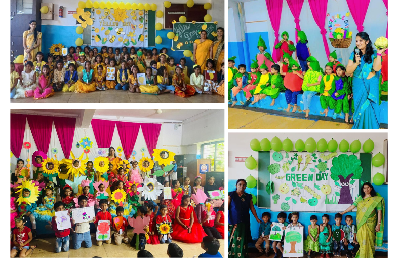 At Benaka Vidya Mandir School, themed days like Yellow Day, Red Day, Cartoon Day, Flower Day, Fruits Day, and Vegetables Day bring vibrant and engaging experiences to students. On Yellow Day and Red Day, students dress in their favorite colors, creating a lively and colorful atmosphere. Cartoon Day allows children to dress as beloved characters, sparking joy and creativity. Flower Day celebrates nature with students bringing and learning about various flowers. Fruits Day and Vegetables Day promote healthy eating, with students exploring different fruits and vegetables through fun activities. These themed days enhance learning and create a joyful school environment.These thematic days at Benaka Vidya Mandir School are not just about fun; they are integral to the school’s approach to holistic education, combining learning with play in a memorable way.